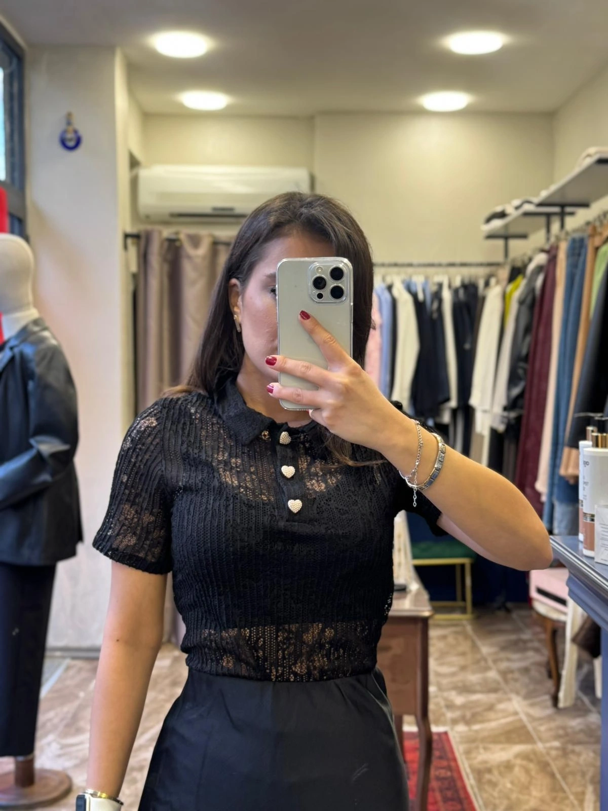 Dantelli Transparan Kalp Düğmeli Bluz – Siyah, feminen ve zarif tasarımıyla kombinlerinize şıklık katar. Transparan detaylar, modern bir görünüm sağlarken, dantel detayı bluze sofistike bir dokunuş ekler. Ön kısımda yer alan kalp düğmeler, modele romantik ve estetik bir hava kazandırır.