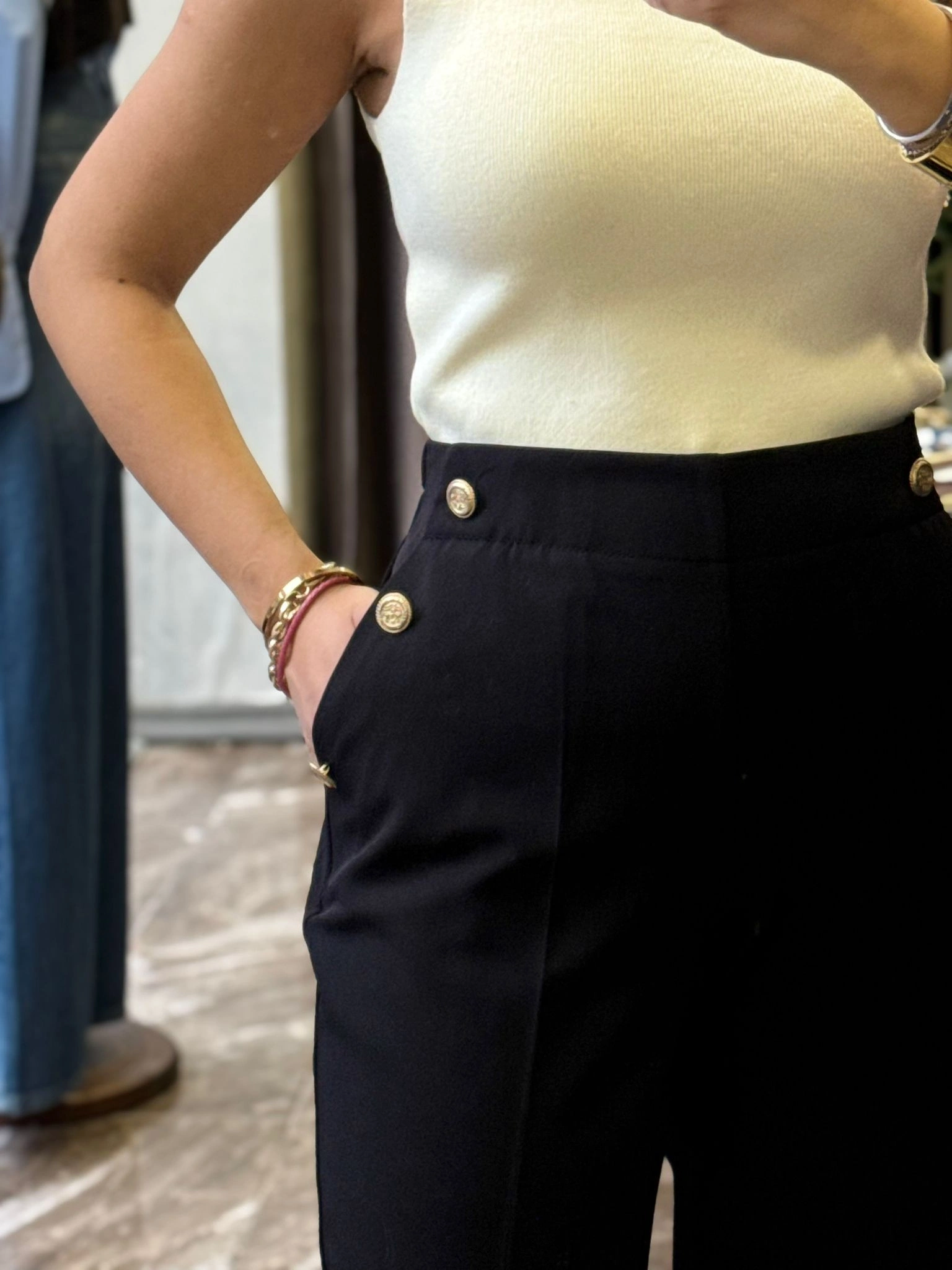 Gold Düğme Detay Beli Lastikli Kumaş Havuç Pantolon – Siyah