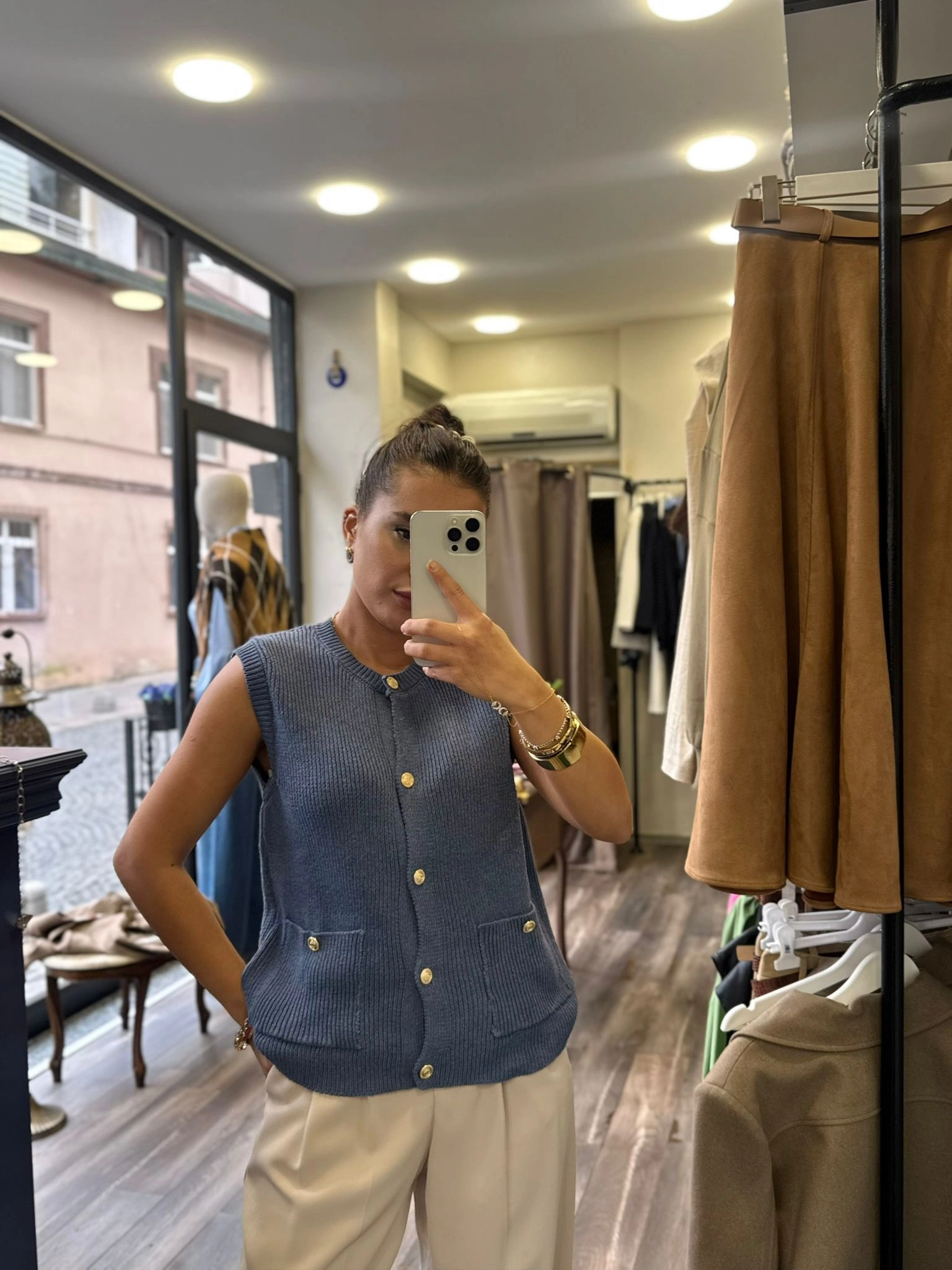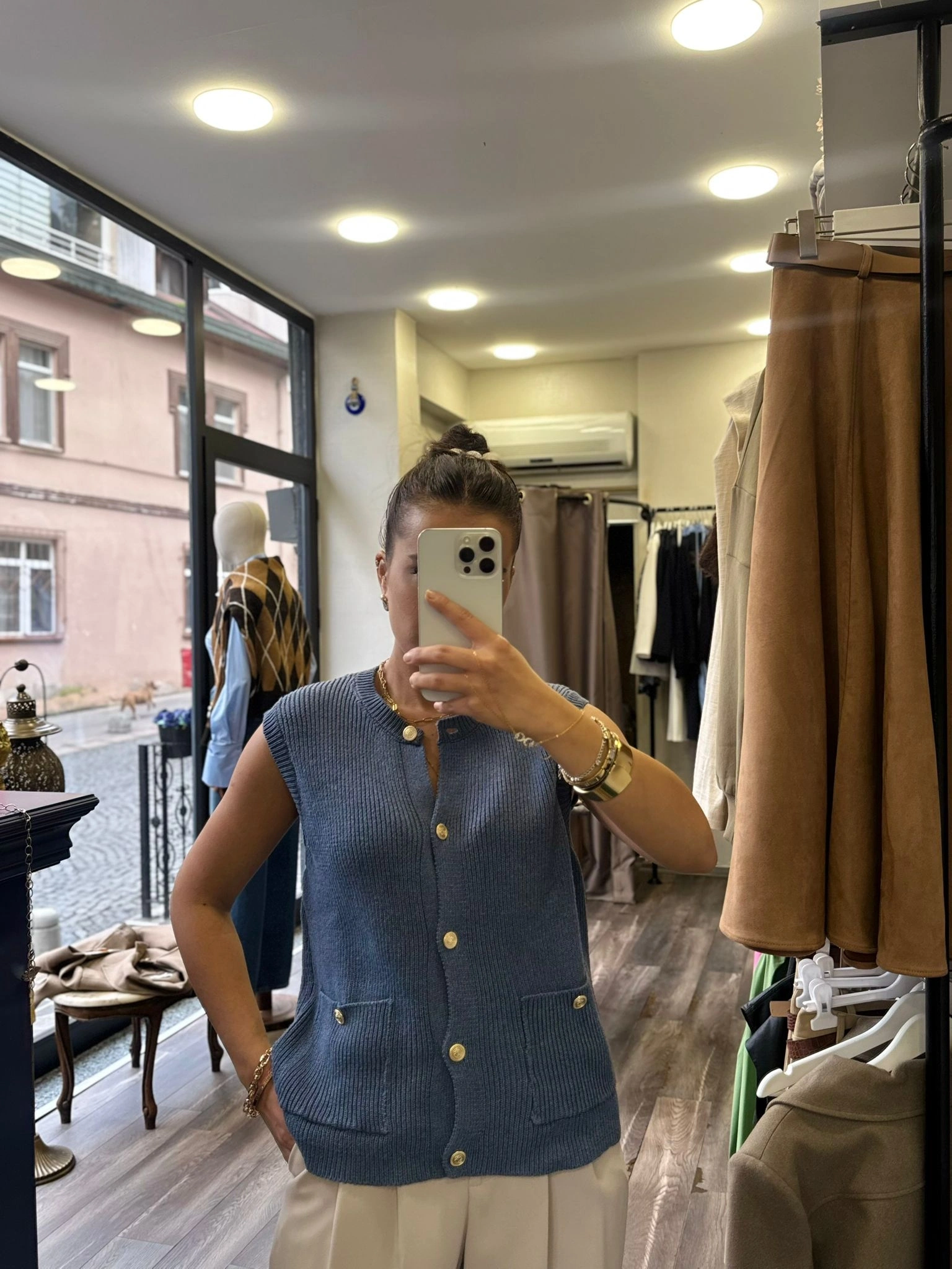Gold Düğme Detay Cepli İndigo Yelek – Antrasit