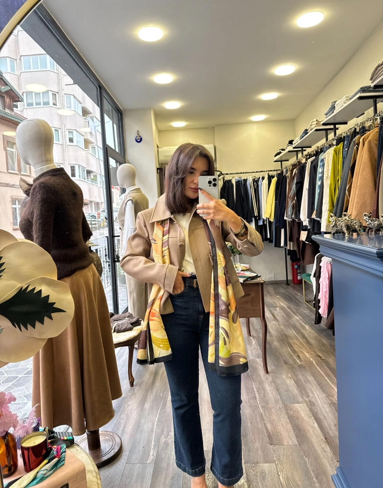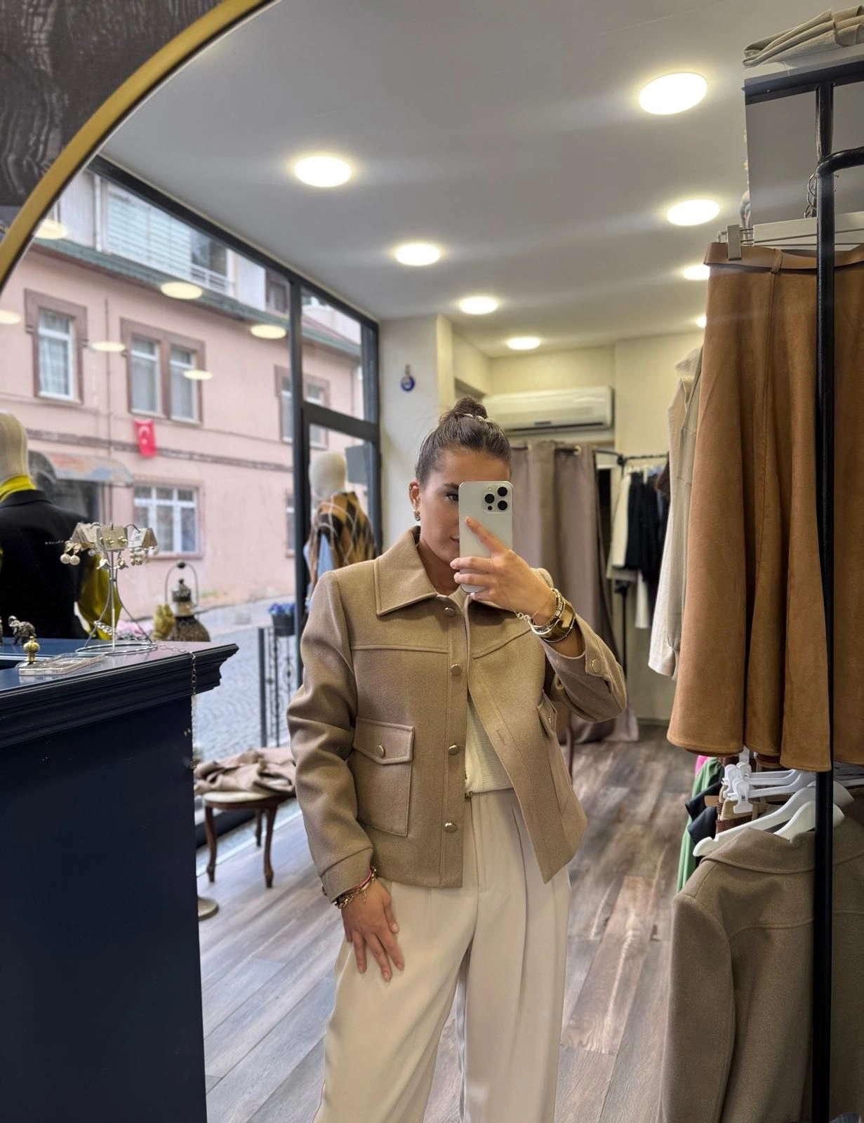 Zamansız tasarımı ve kullanım kolaylığıyla İçi Astarlı Düğmeli Kısa Kaban – Vizon, gardırobunuzun tamamlayıcı parçaları arasında yer alır.
