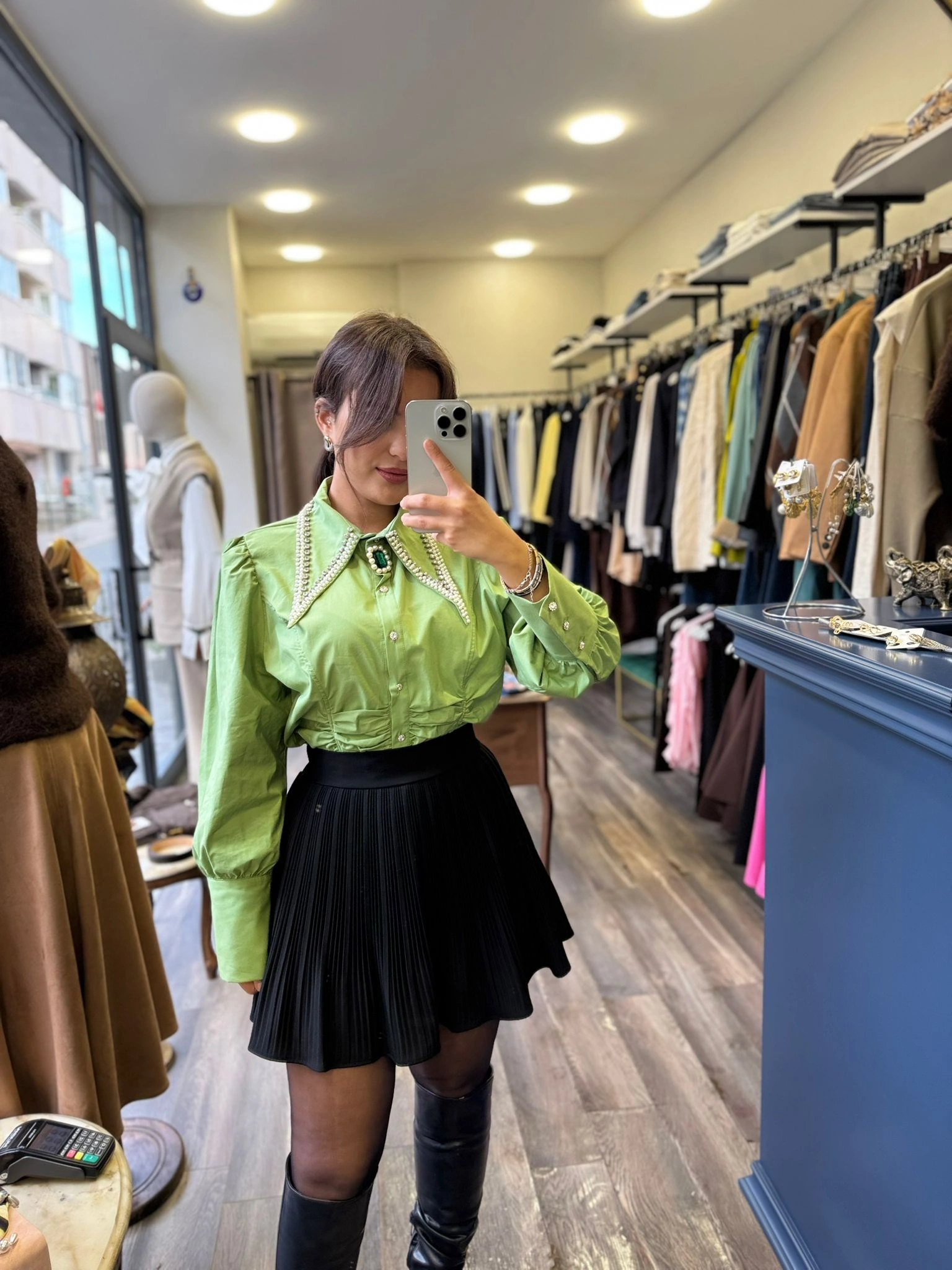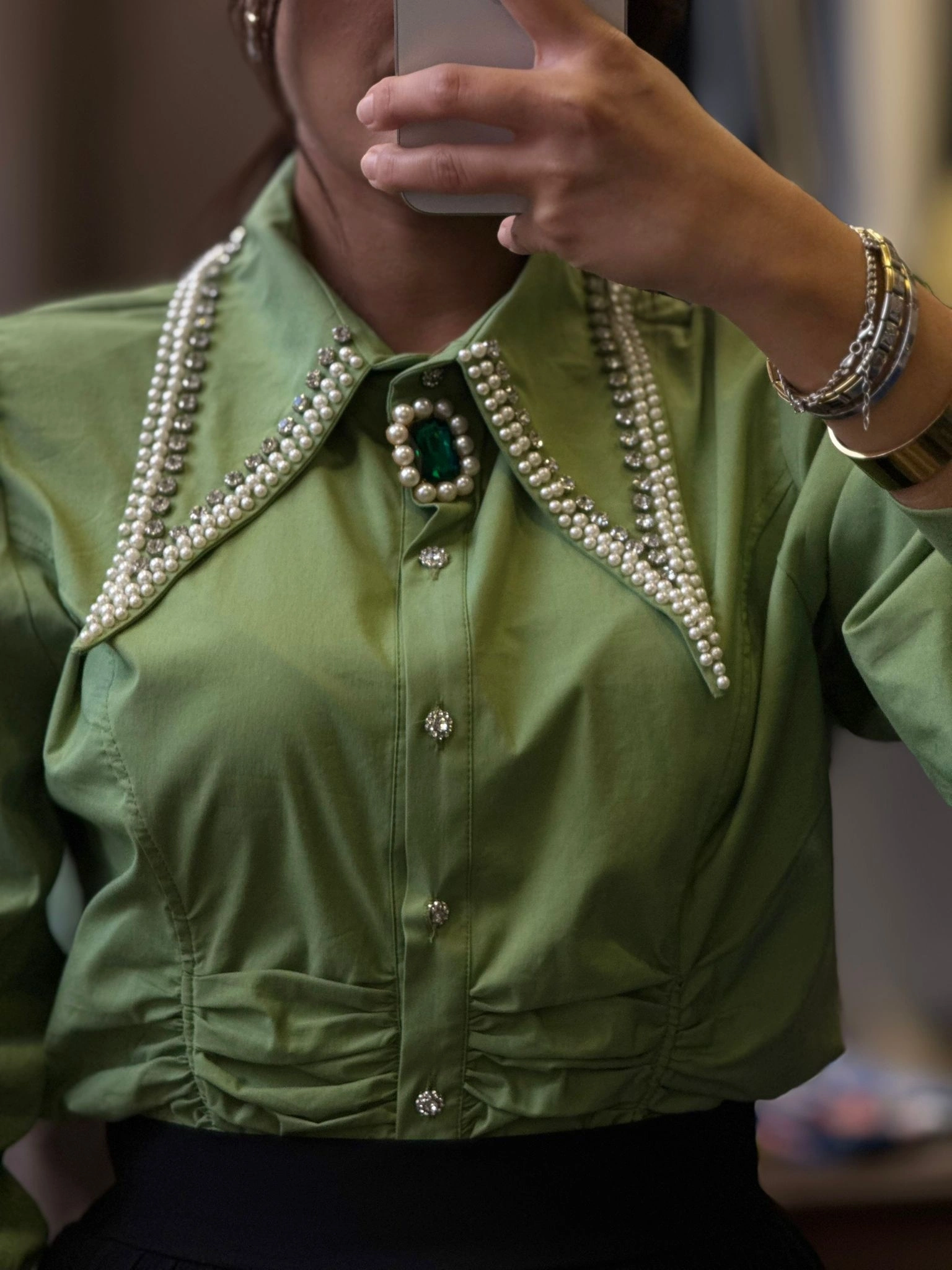 Özel Tasarım Taşlı Kadın Gömlek – Yeşil, zarif detayları ve modern çizgileriyle stilinizi ön plana çıkarır. Özenle yerleştirilmiş taş süslemeleri, gömleğe şık ve dikkat çekici bir görünüm kazandırırken sade tasarımı dengeli bir şekilde tamamlar.