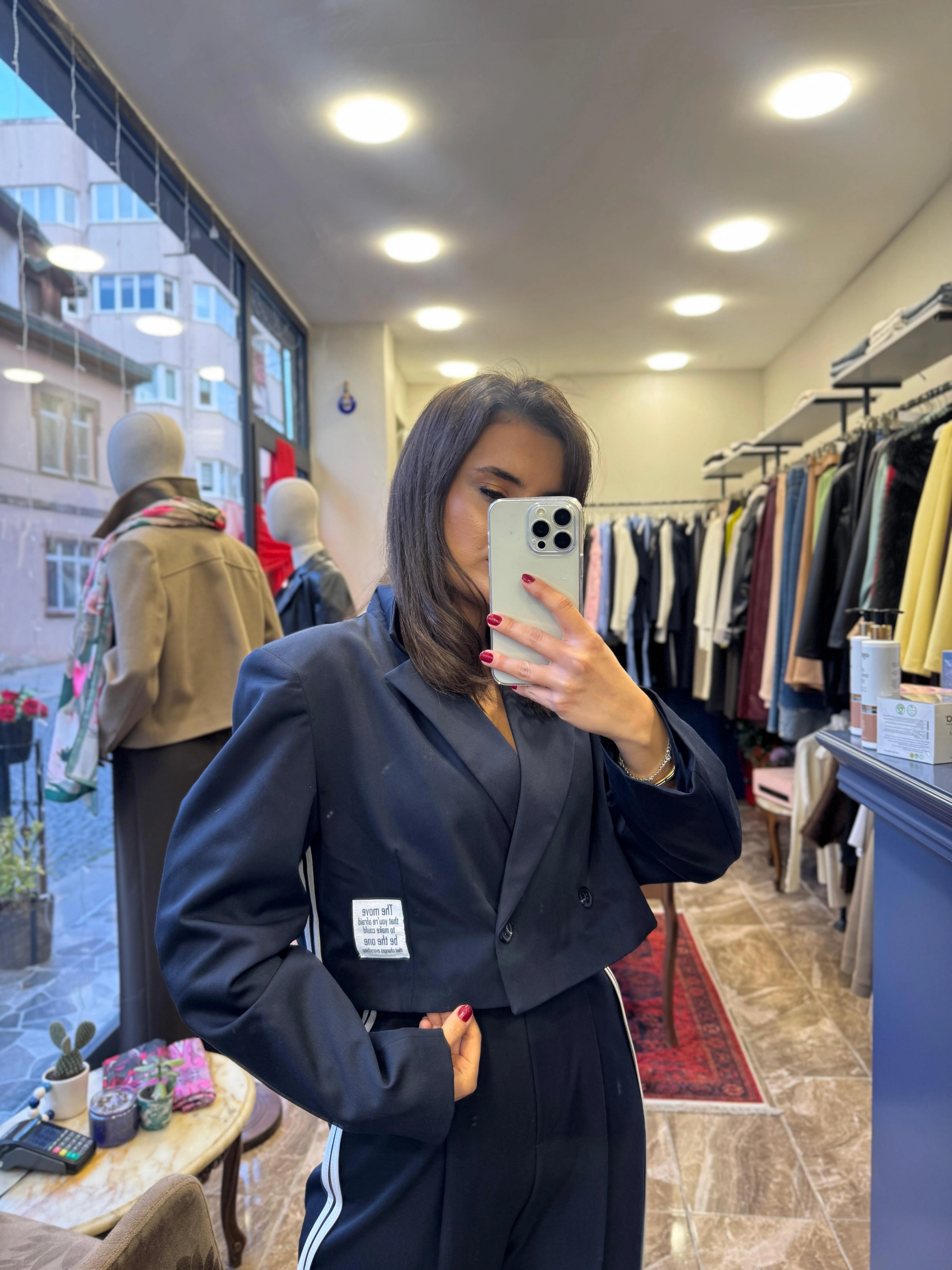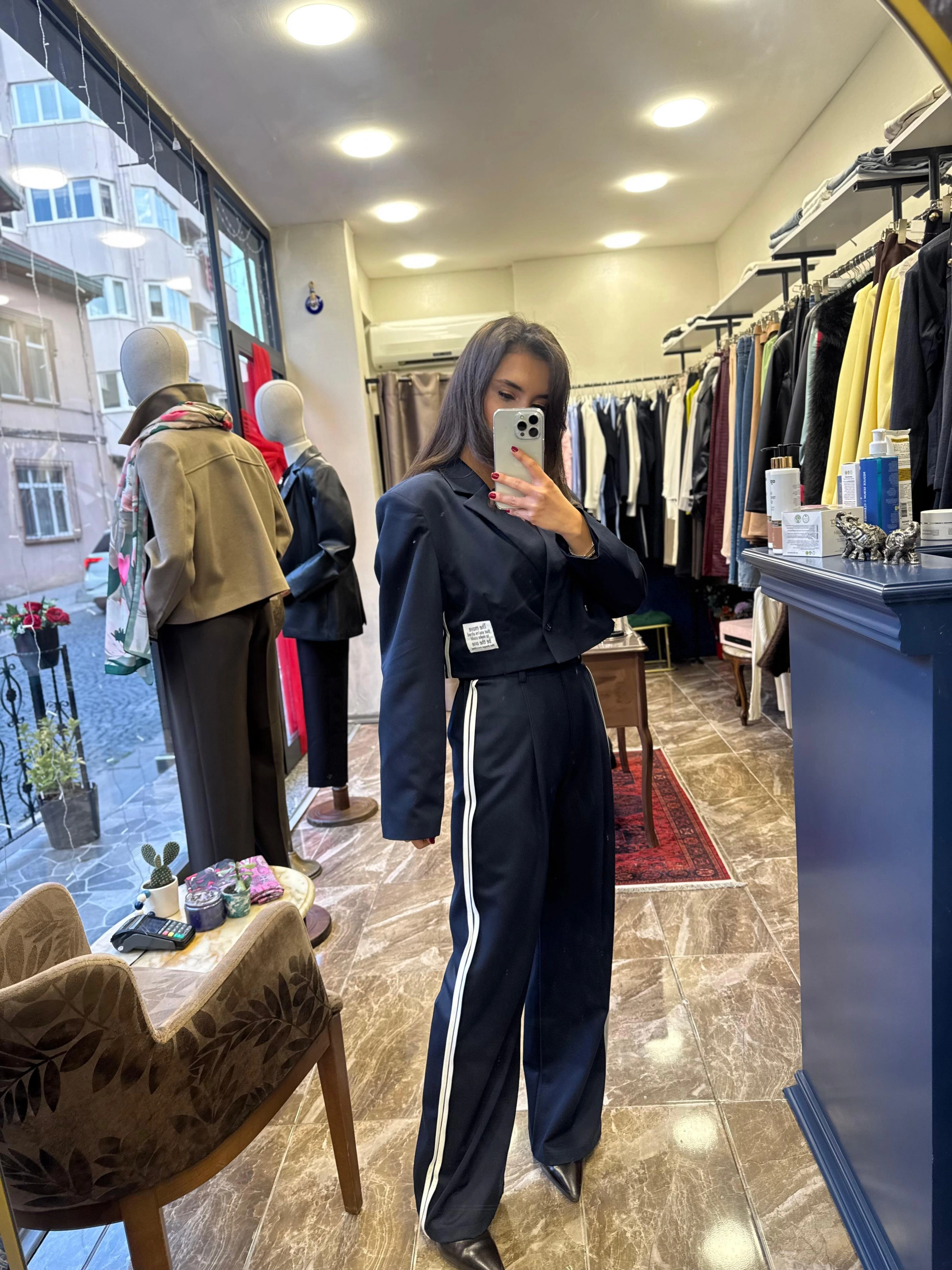 Ceketin kenar biyeleri, modele zarif bir detay katarken, iç kısmındaki astar, konforlu ve rahat bir kullanım sağlar. Crop kesimi, bel hattını ön plana çıkarır ve farklı alt giyim parçalarıyla kolayca kombinlenebilir. Lacivert rengi, klasik ve sofistike bir görünüm sunar.